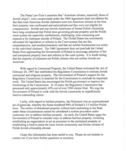 W piśmie znalazło się też stwierdzenie następujące: „Stany Zjednoczone wzywają/ponaglają Rząd RP do rozważenia sposobów rozwiązania sprawy mienia bezspadkowego, w tym do ustanowienia organizacji działającej jako spadkobierca tego mienia lub utworzenia funduszu wspierającego lokalną społeczność żydowską oraz żydowskich byłych obywateli polskich mieszkających za granicą”.
