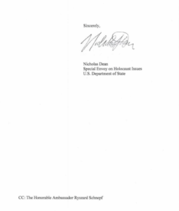 Przedstawiamy pismo Departamentu Stanu USA z 2015 roku skierowane do redaktorów portalu „Nowy Dziennik Polish Daily News”. W piśmie sygnowanym przez Nicholasa Deana, specjalnego wysłannika Departamentu Stanu ds. Holokaustu, przedstawiono stanowisko amerykańskiego rządu w sprawie roszczeń żydowskich kierowanych pod adresem Polski. Pismo oznaczono jako przesłane do wiadomości ambasadora RP w USA Ryszarda Schnepfa.