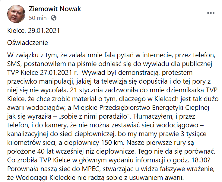 W piątek (29.01.2021) Nowak zamieścił oświadczenie na Facebooku, w którym napisał, że jego wystąpienie było formą protestu przeciw manipulacji TVP3 we wcześniejszym materiale dotyczącym awarii sieci. – Kiedy więc po 6 dniach redakcja TVP Kielce po raz kolejny chciała ze mną porozmawiać o awariach, postanowiłem zaprotestować. Zastosowałem technikę powtarzania w kółko tej samej odpowiedzi na pytania, na które 6 dni wcześniej już odpowiadałem. Technikę znaną i stosowaną gównie przez polityków, z perełką „Już odpowiedziałem na to pytanie” – pisze Nowak.
