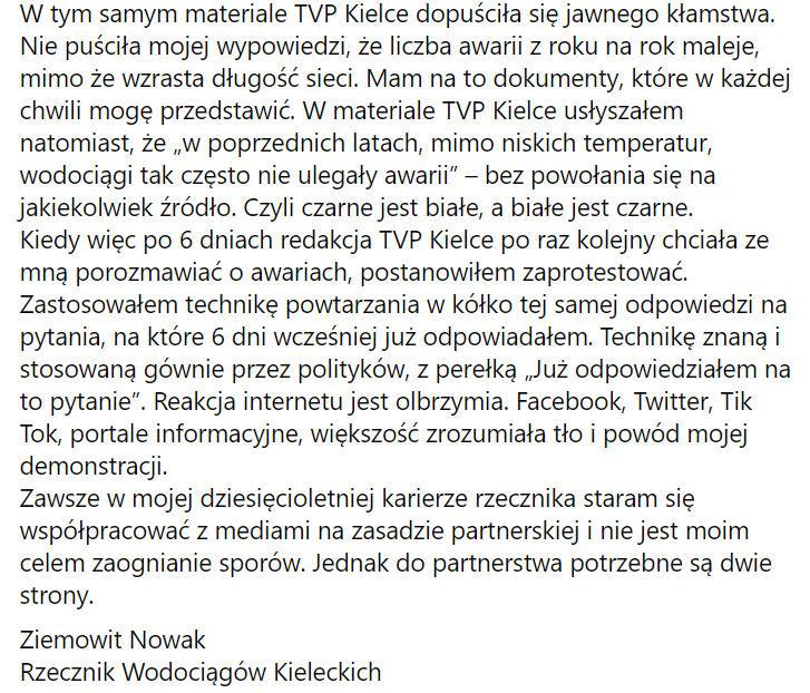 W środę (27.01.2021) rzecznik Wodociągów Kieleckich, Ziemowit Nowak, udzielił wywiadu TVP3 Kielce, w którym odpowiedział na pytanie o przyczyny awarii sieci. – Wodociągi Kieleckie w sposób wzorcowy usuwają awarie, w sposób błyskawiczny. Jesteśmy w czołówce krajowej, a nawet światowej. Liczba awarii z roku na rok maleje – powiedział Nowak. Zapytany ponownie o przyczyny awarii odparł, że już odpowiedział na pytanie. Po kolejnym pytaniu o to, na czym polegała awaria, powtórzył pierwszą odpowiedź.