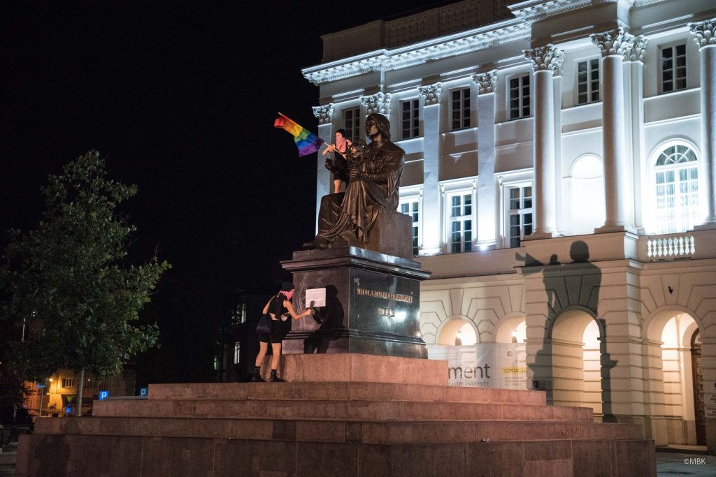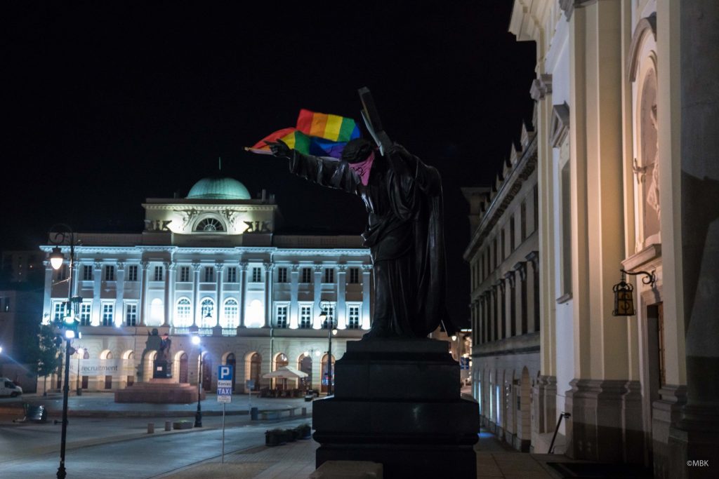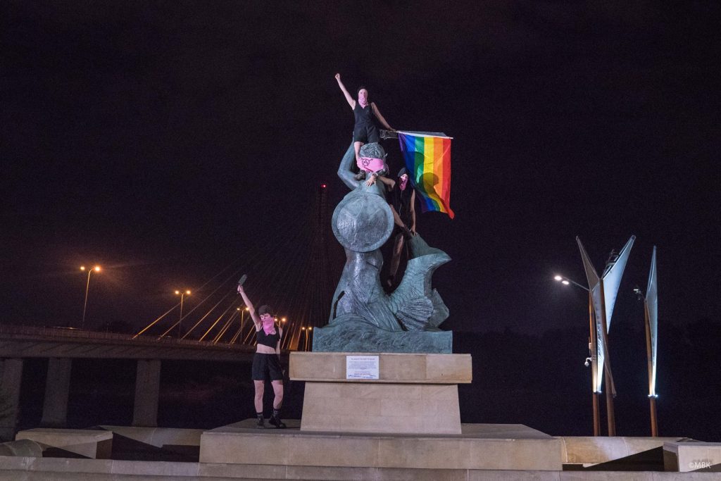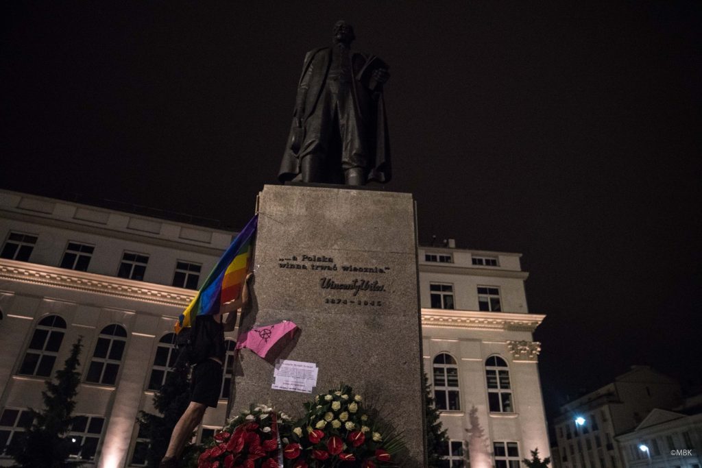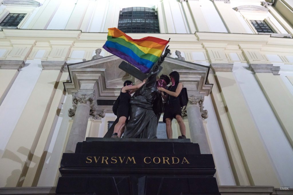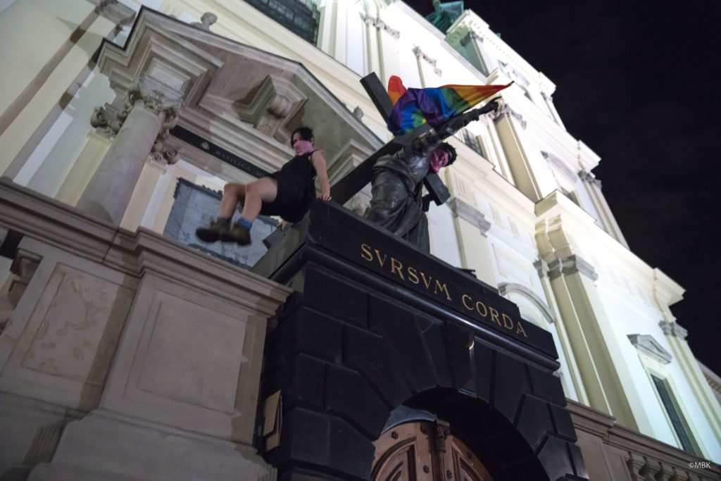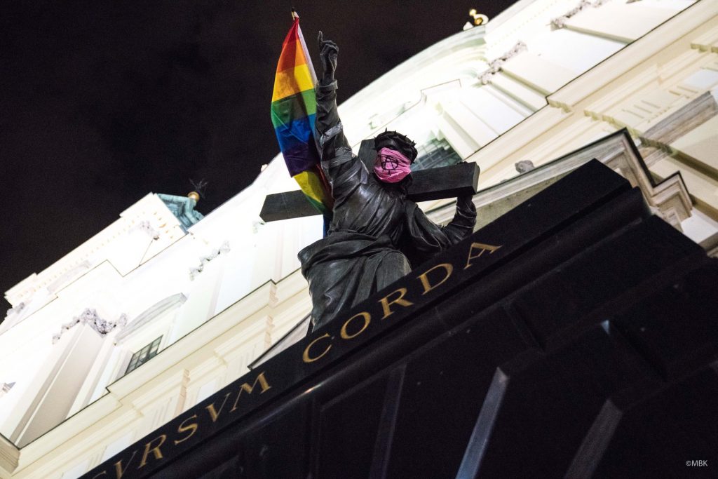 W nocy z 28 na 29 lipca 2020 lewaccy aktywiści sprofanowali rzeźbę Chrystusa dźwigającego Krzyż (Krakowskie Przedmieście), różową szmatą z anarchistycznymi symbolami zasłaniając twarz Zbawiciela, skacząc po nim oraz wciskając w figurę tęczową flagę. Flagę, która wielu Polakom kojarzy się ze różnego rodzaju dewiacjami. W podobny sposób zbezczeszczono pomniki: Józefa Piłsudskiego, Wincentego Witosa, Mikołaja Kopernika i Syrenki Warszawskiej. Na monumentach przyklejono groźby-manifesty z hasłem: „Jebcie się ignoranci!”. Zaś w Internecie zamieszczono infantylny „manifest”: