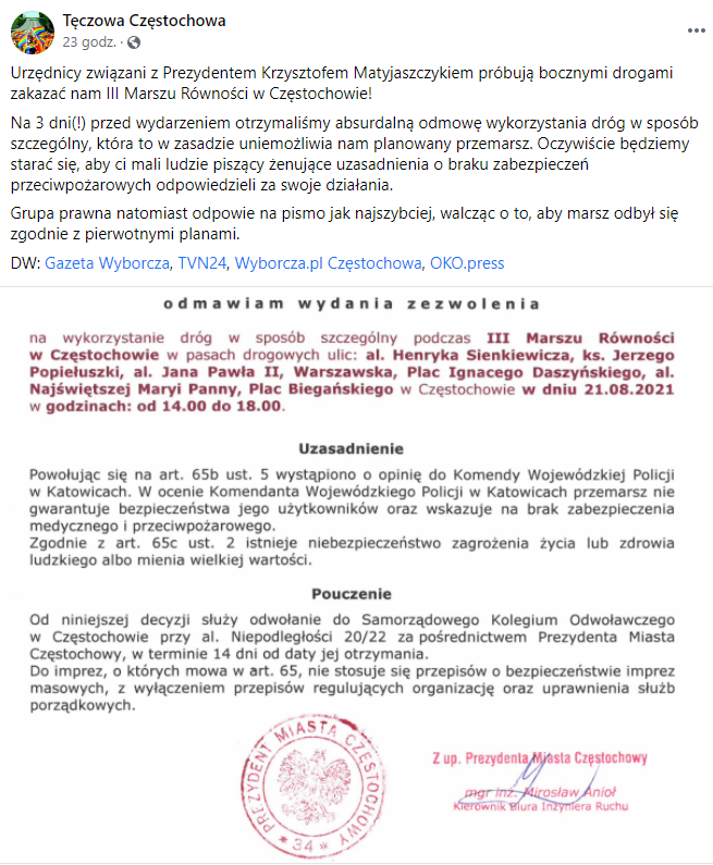 Urząd Miasta usiłował zablokować tę prowokację wydając odmowę wykorzystania pasów drogowych. W uzasadnieniu wskazano, że „przemarsz nie gwarantuje bezpieczeństwa jego uczestników oraz wskazuje na brak zabezpieczenia medycznego i przeciwpożarowego”. Organizatorzy informują, że odmowa wydania zezwolenia jest niezgodna z prawem i marsz odbędzie się na planowanej trasie.