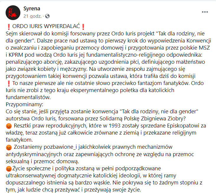 Wulgarny transparent i obrzucenie kościoła racami ma być sprzeciwem wobec obywatelskiego projektu ustawy „Tak dla rodziny, nie dla gender”, który Sejm skierował do prac w komisji. – Dalsze prace nad ustawą to pierwszy krok do wypowiedzenia Konwencji o zwalczaniu i zapobieganiu przemocy domowej i przygotowania przez polskie MSZ i KPRM pod wodzą Ordo Iuris jej fundamentalistyczno-religijnego odpowiednika: penalizującego aborcję, zakazującego uzgodnienia płci, definiującego małżeństwo jako związek kobiety i mężczyzny. Na utworzenie zespołu zajmującego się przygotowaniem takiej konwencji pozwala ustawa, która trafiła dziś do komisji – piszą anarchiści.