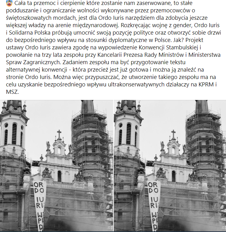 Atak na kościół to akcja anarchistycznego kolektywu „Syrena”, który pochwalił się tym dokonaniem na Facebooku. – To nasze pierwsze ale nie ostatnie słowo przeciwko fantazjom fanatyków. Ordo Iuris nie zrobi z tego kraju eksperymentalnego poletka dla katolickich fundamentalistów – napisali anarchiści.