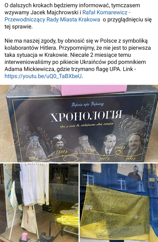 W poniedziałek (5.06.2023) ks. Tadeusz Isakowicz-Zaleski opublikował na Twitterze zdjęcia witryny ukraińskiego sklepu „Dwa Kolory” przy ul. Sławkowskiej 19 w Krakowie. Na jednym w eksponatów znajduje się wizerunek Stepana Bandery.