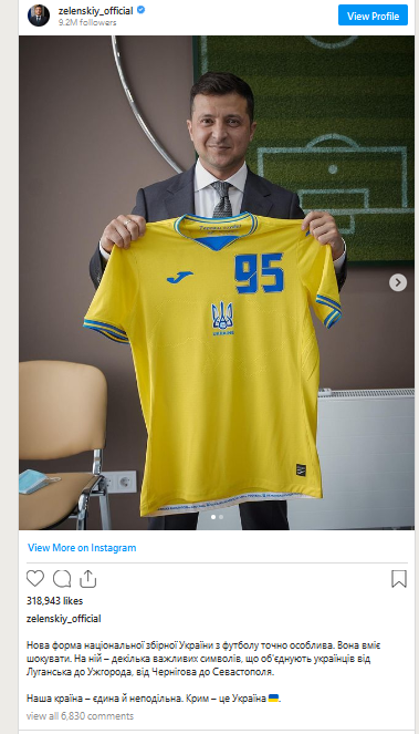 We wtorek koszulkę reprezentacji zaprezentował na Instagramie prezydent Ukrainy Wołodymyr Zełenski. – Nowy strój reprezentacji Ukrainy w piłce nożnej jest zdecydowanie wyjątkowy. On potrafi szokować. Zawiera kilka ważnych symboli, które jednoczą Ukraińców od Ługańska po Użhorod, od Czernihowa po Sewastopol – napisał Zełenski.