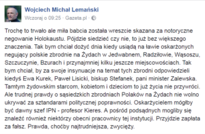 Suspendowany ks. Lemański rozdokazywał się jak pijany zając w kapuście. W związku ze skazaniem przez niemiecki sąd 88-letniej Ursuli Haverbeck za twierdzenie, iż w Auschwitz nie było komór gazowych, Lemański zamieścił taki oto wpis na fb: „Trochę to trwało ale miła babcia została wreszcie skazana za notoryczne negowanie Holokaustu. Pójdzie siedzieć czy nie, to już bez większego znaczenia. Tak bym chciał dożyć dnia kiedy usiądą na ławie oskarżonych negujący polskie zbrodnie na Żydach w Jedwabnem, Radziłowie, Wąsoszu, Szczuczynie, Bzurach i przynajmniej kilku jeszcze miejscowościach. Tak bym chciał, by za swoje insynuacje na temat tych zbrodni odpowiedzieli kiedyś Ewa Kurek, Paweł Lisicki, biskup Stefanek, pani minister Zalewska. Tamtym żydowskim starcom, kobietom i dzieciom to już życia nie przywróci. Ale trudnej prawdy o sąsiedzkich zbrodniach Polaków na Żydach nie wolno ukrywać za sztandarami politycznej poprawności. Oskarżycielem mógłby być dawny szef IPN – profesor Kieres. A pośród podsądnych mogliby się znaleźć również niektórzy obecni pracownicy tej instytucji. Przyjdzie zapłata za fałsz. Prawda, choćby najtrudniejsza, zwycięży.”