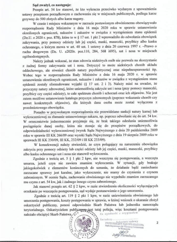 Nie ma też podstawy prawnej do karania mandatem za brak maseczki, co stwierdził Sąd Rejonowy dla Warszawy-Śródmieście wskazując, że czyn polegający na braku zakrycia nosa i ust nie jest wykroczeniem, ani żadnym innym czynem zabronionym.