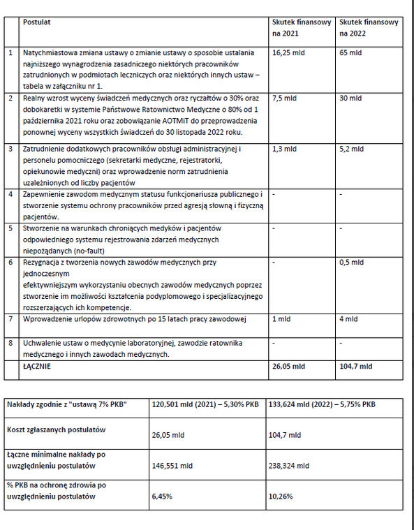 Minister zdrowia Adam Niedzielski przedstawił oszacowanie postulatów komitetu strajkowego. Wg wyliczeń Ministerstwa Zdrowia byłoby to dodatkowe 100 mld zł w 2022 roku oraz ponad 25 mld zł jeszcze w tym roku, co oznaczałoby konieczność podwojenia nakładów i przekroczenie 10% PKB.