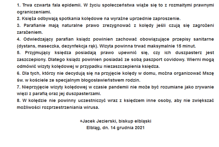 We wtorek (14.12.2021) na stronie diecezji elbląskiej zostały opublikowane wytyczne biskupa Jacka Jezierskiego dotyczące kolędy 2021/2022. – Przyjmujący księdza posiadają prawo upewnić się, czy ich duszpasterz jest zaszczepiony. Dlatego ksiądz powinien posiadać ze sobą paszport covidowy. Wierni mogą odmówić wizyty kolędowej w przypadku niezaszczepienia księdza – pisze biskup.