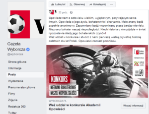 W związku ze zbliżającą się rocznicą 100-lecia odzyskania przez Polskę niepodległości „Gazeta Wyborcza” zorganizowała konkurs „Nieznani bohaterowie naszej niepodległości”. „Opowiedz nam o człowieku wielkim, wyjątkowym, porywającym serca innych. Opowiedz o jego życiu, bohaterstwie i charyzmie. Mało znany bądź zupełnie anonimowy. Zapomniany bądź wspominany przez bardzo niewielu. Nieznany bohater naszej niepodległości. Niech historia o nim pójdzie w świat i pozostawia ślady jego bohaterskich czynów! Weź udział w konkursie i stwórz z nami pierwszą wielką prywatną historię ostatnich stu lat Polski. Opowieści zamiast pomników” – czytamy na fb „Wyborczej”.