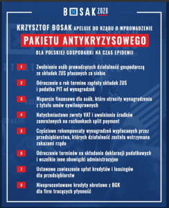 Propozycje rządu skomentował Krzysztof Bosak, kandydat Konfederacji na prezydenta. – W propozycjach premiera Mateusza Morawieckiego tradycyjnie brak konkretów: brak wskazania źródeł finansowania (podobnie zresztą jak wcześniej w SOR), brak założeń do projektów ustaw, brak odniesienia do progów ostrożnościowych – napisał Bosak na Twitterze i załączył infografikę z propozycjami Konfederacji. To m.in. zwolnienie osób prowadzących działalność gospodarczą ze składek ZUS płaconych za siebie, odroczenie o rok płatności ZUS za pracowników i podatku PIT, natychmiastowy zwrot VAT, ustawowe zawieszenie spłat kredytów i leasingów dla przedsiębiorców, nieoprocentowane kredyty obrotowe dla firm tracących płynność.