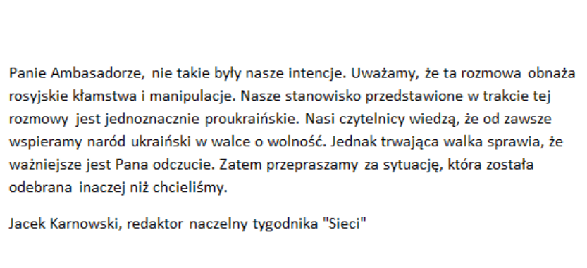 W poniedziałek (28.02.2022) do sprzedaży trafił się tygodnik „Sieci”, w którym opublikowano wywiad z ambasadorem Rosji, Siergiejem Andriejewem, przeprowadzony przez Jacka i Michała Karnowskich. Rozmowa odbyła się 22 lutego, a więc przed uderzeniem Rosji na Ukrainę. Wywiad pt. „Rosjo, dlaczego to robisz?” został opatrzona poniższym wstępem.