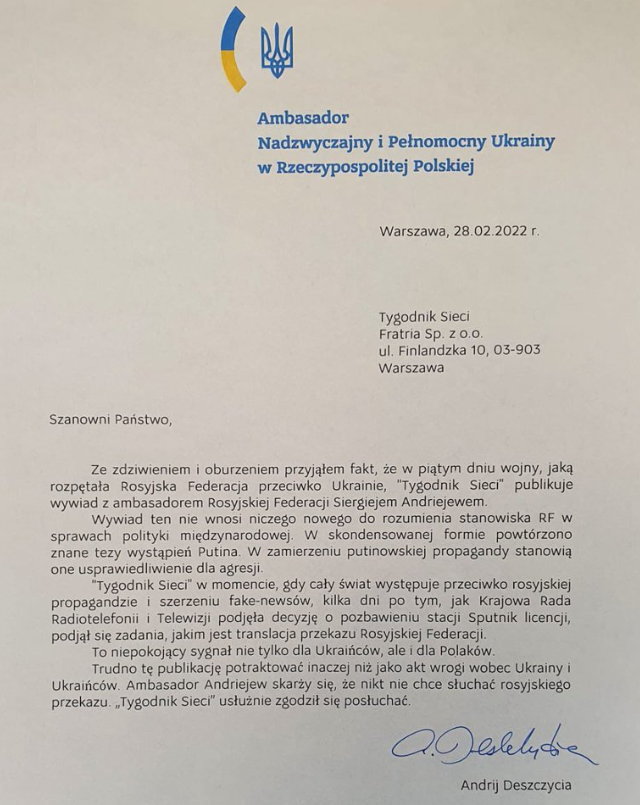 W reakcji na publikację wywiadu ambasador Ukrainy, Andrij Deszczyca, wystosował list do „Sieci”, w którym stwierdził, że tygodnik „podjął się zadania, jakim jest translacja przekazu Federacji Rosyjskiej”. – Trudno tę publikację potraktować inaczej niż jako akt wrogi wobec Ukrainy i Ukraińców. Ambasador Andriejew skarży się, że nikt nie chce słuchać rosyjskiego przekazu. „Tygodnik Sieci” usłużnie zgodził się posłuchać – napisał Deszczyca. List został opublikowany na koncie TT ambasady.