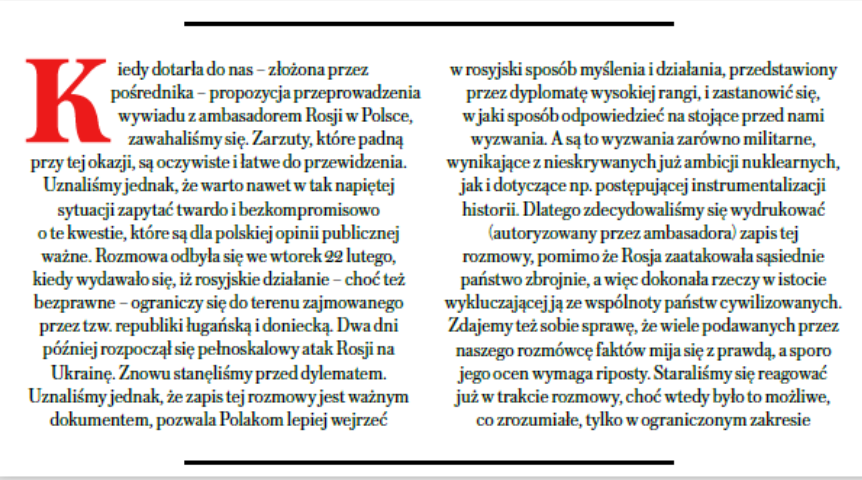 Nie rozumiem decyzji redakcji w Sieci opublikowania 11 – str. wywiadu z ambasadorem Rosji. To nie jest bieżące relacjonowanie wydarzeń ale traktowanie bandytów jak równoprawnego partnera. Apeluje by nigdy więcej nie zdarzyło się to w polskiej prasie.