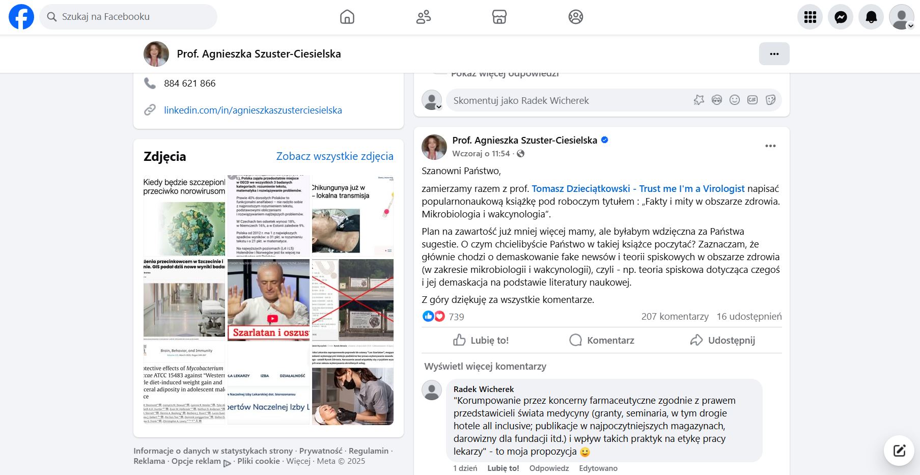 OD AUTORA: Miałem już do czynienia z dr Szuster-Ciesielską. W czasie „pandemii” wdałem się na jej profilu w długą dyskusję z jednym z komentujących (prawdopodobnie chodziło o procedury obowiązujące przy dopuszczeniu szczepionek do obrotu). W pewnym momencie, choć mój oponent reprezentował skrajnie odmienne stanowisko, wysunięte przeze mnie argumenty były na tyle precyzyjne i dokładne, że pojawiła się szansa, iż uda mi się go przekonać. Wymiana zdań została błyskawicznie skasowana. Jakież było zdziwienie pani dr kiedy osobiście zadzwoniłem do niej, by zapytać ją dlaczego. Z wahaniem przyznała, że zatrudnia modyfikatora. Stąd zapewne niemal jednomyślna narracja w komentarzach. Mimo to, w odpowiedzi na zadane przez Agnieszkę Szuster-Ciesielską pytanie „O czym byście chcieli Państwo w takiej książce poczytać?” ośmieliłem się wysunąć swoją propozycję, widoczną na zrzucie ekranu. Jeżeli Wam odpowiada, zachęcam do polubienia lub wstawienia swojej.