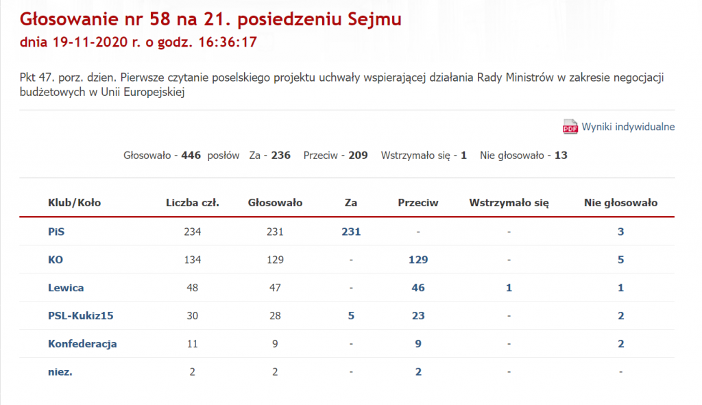 Uchwała sejmowa wskazuje, że „konsekwencje nadużycia tych regulacji przez Komisję Europejską mogą doprowadzić do całkowitego wstrzymania wsparcia finansowego dla państw członkowskich”. W uchwale wyrażono uznanie dla „zablokowania przez przedstawicieli Polski dalszych prac nad pakietem rozwiązań budżetowych” oraz wezwano „rządy wszystkich państw członkowskich Unii Europejskiej oraz organy UE do powrotu do rozmów i do osiągnięcia porozumienia zgodnego z unijnymi Traktatami oraz Konkluzjami Rady Europejskiej z 17-21 lipca 2020 roku”. Przeciw uchwale głosowała Koalicja Obywatelska, Lewica, PSL (za wyjątkiem 5 posłów z Kukiz’15) i Konfederacja. Imienne wyniki głosowania TUTAJ.