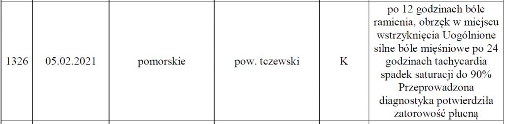 Na liście niepożądanych odczynów poszczepiennych, publikowanej na rządowej stronie gov.pl i zaktualizowanej do 6 lutego, pojawiła się informacja o dwunastym zgonie po szczepieniu na Covid-19. – Porażenie kończyn, sinica, duszność, zgon – czytamy w opisie. Wśród niepożądanych odczynów poszczepiennych wymieniono także udar po drugiej dawce oraz zatorowość płucną.