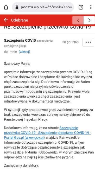 Co więcej, w odpowiedzi na pytanie o możliwość zwolnienia z pracy za brak szczepienia Ministerstwo Zdrowia odpowiedziało pytającemu, że szczepienia na Covid-19 są dobrowolne, a jeśli pracodawca grozi sankcjami za jego brak, należy to zgłosić do Państwowej Inspekcji Pracy. Odpowiedź MZ została przesłana po wejściu w życie rozporządzenia o obowiązku szczepień dla pracowników placówek medycznych.