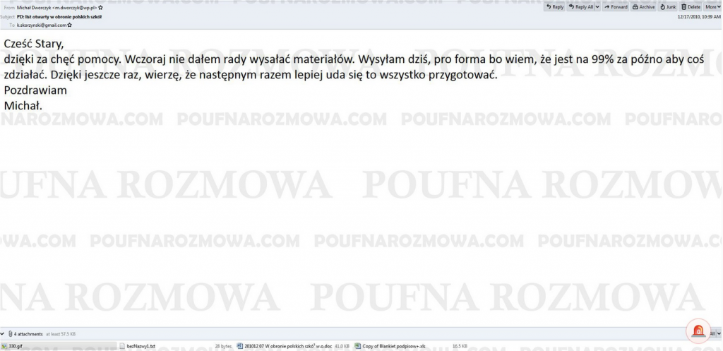 Upubliczniono także mail Dworczyka do Skórzyńskiego z 17 grudnia 2010 roku. Dworczyk zwraca się do dziennikarza: „Cześć Stary” i dziękuje mu za chęć pomocy. Nie ulega wątpliwości, że w takiej formie piszą do siebie osoby pozostające w bliskich kontaktach.