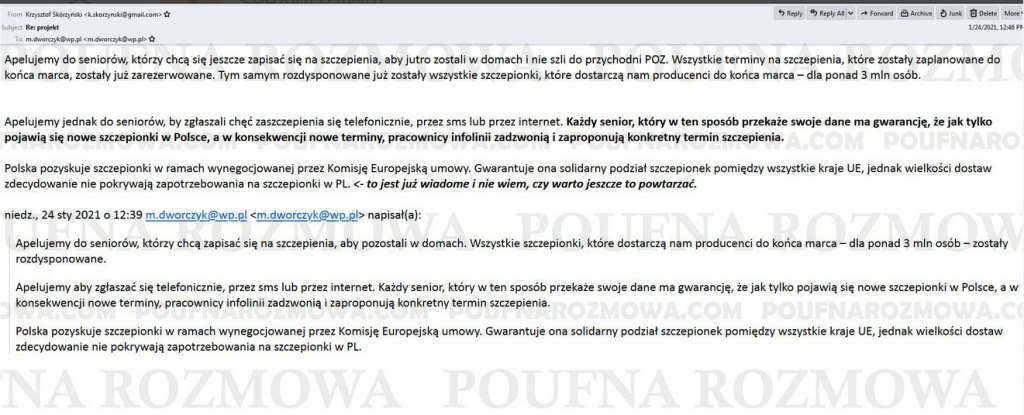 24 stycznia 2021 roku Dworczyk wysłał do Skórzyńskiego mail z komunikatem dotyczącym zapisów seniorów na szczepienia. Skórzyński odesłał tekst z naniesionymi przez siebie poprawkami.