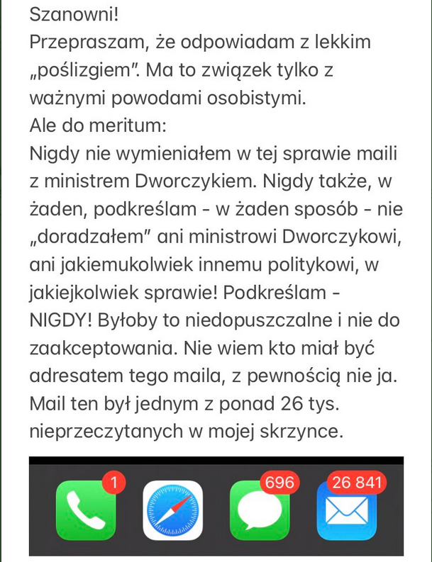 Powyższa korespondencja to nie wszystko. W piątek (17.09.2021) upubliczniono mail, który Dworczyk wysyłał do Skórzyńskiego w listopadzie 2019 roku w sprawie propozycji odpowiedzi na pytania dziennikarki OKO.press. Tego samego dnia Skórzyński wydał oświadczenie, w którym zapewniał, że nigdy nie doradzał Dworczykowi, a opublikowany mail był jednym z 26 tysięcy nieprzeczytanych wiadomości w jego skrzynce.