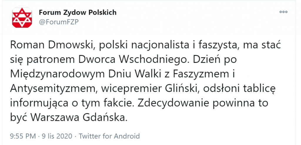 Jak należało się tego spodziewać, uhonorowanie polskiego patrioty doprowadziło do szału naszych żydowskich „starszych braci” – Roman Dmowski, polski nacjonalista i faszysta, ma stać się patronem Dworca Wschodniego. Dzień po Międzynarodowym Dniu Walki z Faszyzmem i Antysemityzmem, wicepremier Gliński, odsłoni tablicę informująca o tym fakcie. Zdecydowanie powinna to być Warszawa Gdańska – taki wpis pojawił się w poniedziałek na twitterowym koncie Forum Żydów Polskich.