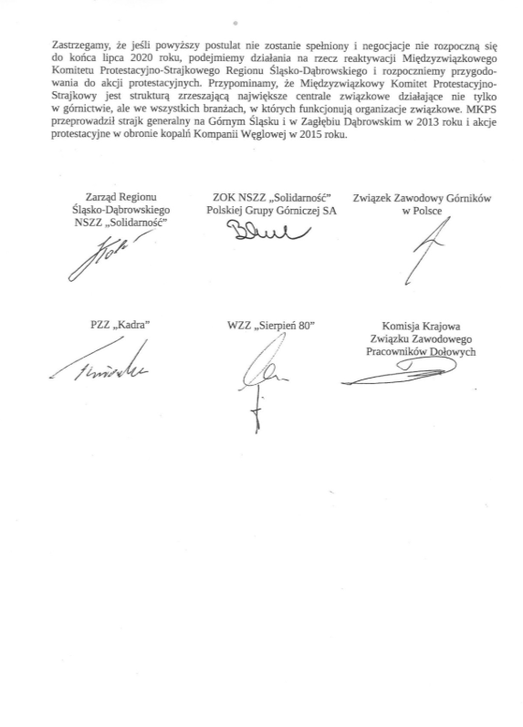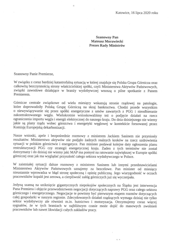 W czwartek (16.07.2020) górnicze centrale związkowe wystosowały list do premiera Mateusza Morawieckiego, w którym zapowiadają rozpoczęcie akcji protestacyjnej, jeśli premier nie zacznie z nimi rozmawiać o ratowaniu polskiego górnictwa. Wskazują, że ich rozmowy z ministrem Jackiem Sasinem nie przyniosły żadnych rezultatów, a Ministerstwo Aktywów Państwowych nie podjęło żadnych realnych kroków na rzecz uzdrowienia sytuacji w polskim górnictwie i energetyce.