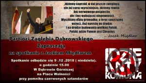 W najbliższą niedzielę, 9 grudnia 2018 roku, wbrew agresywnym lewackim protestom, w wigilię rocznicy wprowadzenia stanu wojennego w Polsce o godzinie 15.00 na pl. Wolności w Dąbrowie Górniczej odbędzie się „Antykomuna”, połączona z nieformalnym spotkaniem autorskim Jacka Międlara. Podczas spotkania uczestnicy manifestacji oddadzą cześć ofiarom stalinizmu i stanu wojennego w Polsce, zwłaszcza górnikom z Kopalni Wujek oraz powiedzą stanowcze NIE propagowaniu komunizmu.