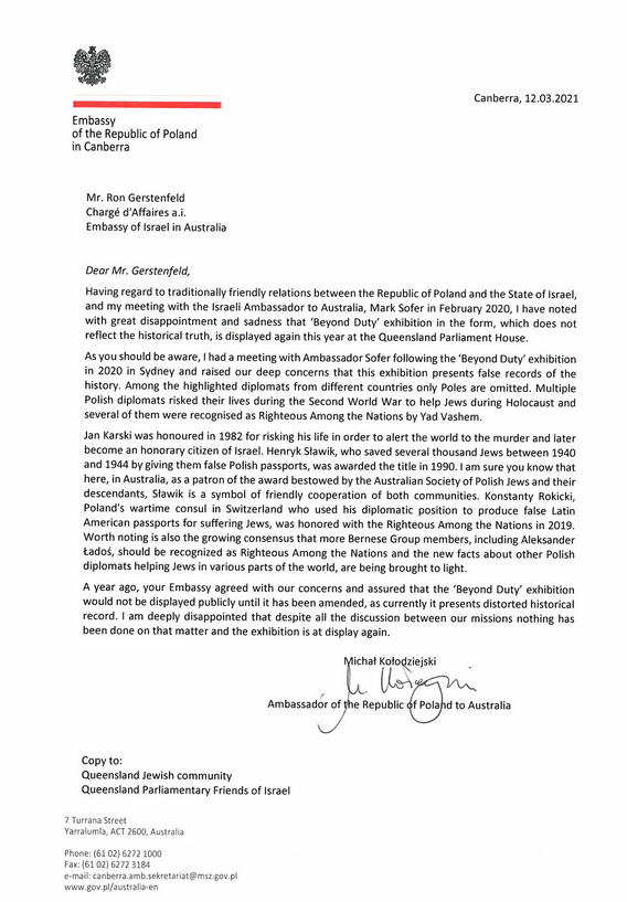 10 marca 2021 roku w Brisbane, w siedzibie parlamentu stanu Queensland, otwarto wystawę poświęconą dyplomatom ratującym Żydów podczas Holokaustu. Wystawa „Beyond Duty” („Ponad obowiązek”) została przygotowana w 2018 roku przez instytut Jad Waszem na zlecenie izraelskiego ministerstwa spraw zagranicznych. Wystawa w rażący sposób fałszuje historię pomijając polskich dyplomatów zaangażowanych w ratowanie Żydów.