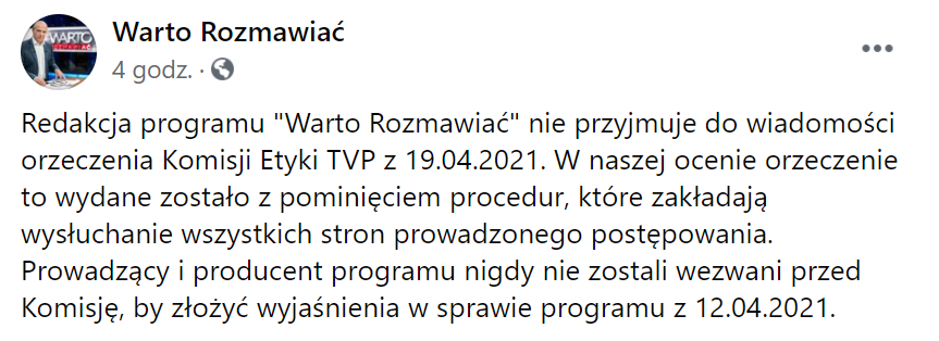 „We wtorek (20.04.2021) Telewizja Polska wydała komunikat, w którym stwierdzono, że Komisja Etyki TVP orzekła, iż w programie zostały naruszone zasady etyki dziennikarskiej ……
