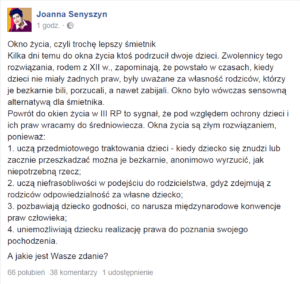 Kolejnym dowodem na to, że zwolennikom aborcji nie chodzi o czyjekolwiek dobro, jest dzisiejszy wpis Senyszyn na fb, w którym bezpardonowo zaatakowała okna życia, czyli specjalnie przygotowane miejsce umożliwiające matkom, które nie mogą lub nie chcą opiekować się noworodkiem, anonimowe i bezpieczne pozostawienie dziecka. Senyszyn nazwała okna życia „trochę lepszym śmietnikiem” i „powrotem do średniowiecza”, ponieważ „uczą przedmiotowego traktowania dzieci” i „ pozbawiają dziecko godności”.