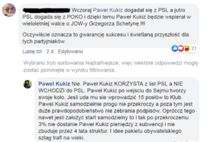 Jak decyzję o starcie z listy PSL tłumaczy Paweł Kukiz? Oto treść komentarza, który zamieścił na Facebooku odpowiadając na krytyczny wpis internauty. „Paweł Kukiz korzysta z list PSL, a nie wchodzi do PSL. Paweł Kukiz po wejściu do Sejmu tworzy swoje koło. Jeśli uda mu się wprowadzić 15 posłów to klub. Paweł Kukiz samodzielnie progu nie przekroczy, a poza tym jest duże prawdopodobieństwo niezebrania podpisów. Oprócz tego nawet jeśli założyć start samodzielny, to i tak po przekroczeniu 3% nie dostanie Paweł Kukiz pieniędzy z subwencji i nie zbuduje przez 4 lata struktur. I idee pakietu obywatelskiego szlag trafi na wieki” – czytamy w komentarzu Pawła Kukiza.