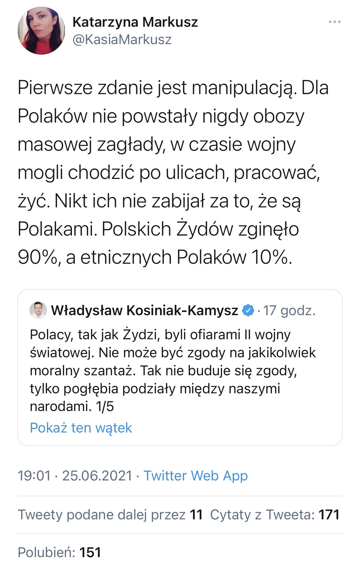 Markusz skomentowała na Twitterze wpis Władysława Kosiniaka-Kamysza dotyczący żydowskiej impertynencji ws. nowelizacji ustawy o Kpa. Szef PSL zwróci uwagę, że „Polacy, tak jak Żydzi, byli ofiarami II wojny światowej”.