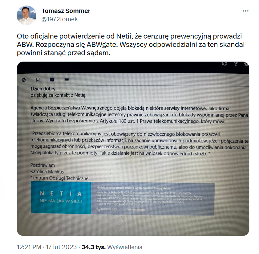 Jaki „uprawniony podmiot” zażądał nałożenia blokady na „Najwyższy Czas”? Zagadka wyjaśniła się dziś, czyli 17 lutego 2023 roku, gdy na pytanie Sommera o przyczyny blokady odpowiedziała Netia wskazując Agencję Bezpieczeństwa Wewnętrznego jako podmiot, który objął blokadą niektóre serwisy internetowe. Oczywiście na podstawie przepisów dotyczących zagrożenia dla obronności i bezpieczeństwa państwa.