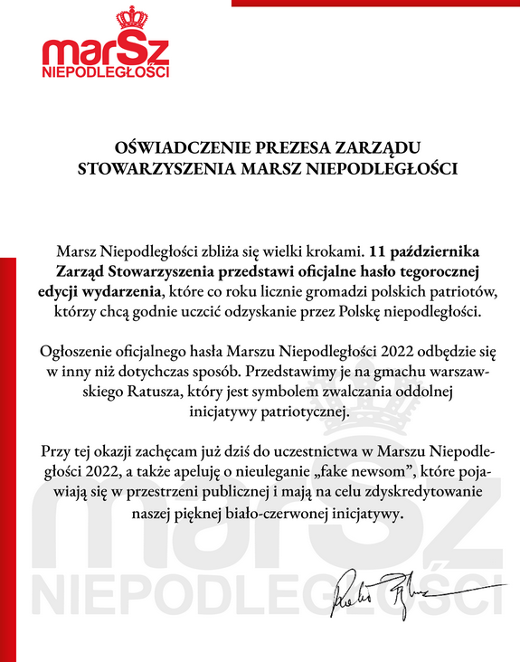 Bąkiewicz wykonał klasyczny ruch wyprzedzający. Przed konferencją Ruchu Narodowego i Młodzieży Wszechpolskiej opublikował na Twitterze oświadczenie, w którym poinformował, że hasło tegorocznego Marszu Niepodległości zostanie podane do wiadomości dopiero 11 października. – Apeluję o nieuleganie „fake newsom”, które pojawiają się w przestrzeni publicznej i mają na celu zdyskredytowanie naszej pięknej biało-czerwonej inicjatywy – napisał.