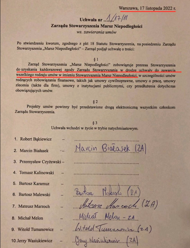 Po tej dygresji wróćmy do sprawy wynajęcia siedziby stowarzyszenia spółce akcyjnej Bąkiewicza i Barełkowskiego. Na czym polega bezprawność umowy najmu? Wiceprezes stowarzyszenia Witold Tumanowicz opublikował na Twitterze uchwałę zarządu Stowarzyszenia Marsz Niepodległości, podjętą 17 listopada 2022 roku, w myśl której prezes stowarzyszenia został zobowiązany do uzyskania zgody zarządu (w formie uchwały) na zawieranie umów w imieniu stowarzyszenia. Spółka akcyjna TVMN rozpoczęła działalność 27 stycznia 2023 roku. Umowa najmu została podpisana bez zgody zarządu.
