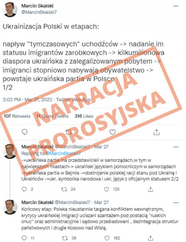 W związku z powyższym oburzone dziennikarki śledcze informują, że „jednym z kluczowych antyukraińskich kont, odpowiedzialnych za upowszechnienie hasła „ukrainizacja” na polskim Twitterze okazał się profil Marcina Skalskiego”. Szacowany wpływ wpisów Skalskiego to 1,5 miliona odsłon. – Od wybuchu wojny do czasu ogłoszenia przez Brauna programu „Stop ukrainizacji Polski” hasło ukrainizacji zyskuje rozgłos i staje się jedną z najpopularniejszych narracji antyukraińskich. Upowszechniają je działacze i sympatycy Konfederacji, telewizja wRealu24 Marcina Roli i Jacek Międlar. Sieć fanpejdży związanych z Międlarem już w styczniu straszy pretekstem do ukrainizacji Polski, linkując do artykułu w portalu wprawo.pl – to ten, w którym od niedawna publikuje Marcin Skalski. (…) W kwietniu opisywaliśmy jaką rolę w debacie o ukrainizacji odgrywała aktywność w sieci szefowej fundacji Wołyń Pamiętamy Katarzyny Sokołowskiej i Jacka Międlara, redaktora naczelnego wprawo.pl (przypomnijmy – od czerwca publikuje tam Marcin Skalski). To właśnie za sprawą tej aktywności w polskich mediach społecznościowych coraz więcej osób dyskutowało o UPA i rzezi wołyńskiej. EUvsDisinfo zwracało wtedy uwagę, że „trendowanie ‘rzezi wołyńskiej’ na polskim Twitterze zostało zainicjowane lub przynajmniej wsparte przez rosyjskie farmy trolli” – piszą dziennikarki z Frontstory.pl.