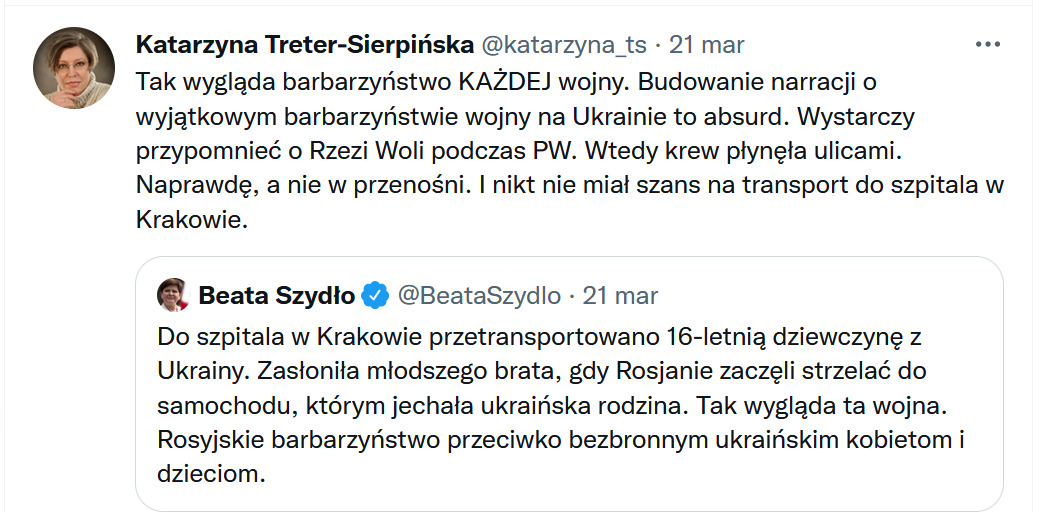 Teraz pora na moją ocenę wyżej wzmiankowanego dorobku dziennikarzy śledczych z Frontstory.pl. To nie jest dziennikarstwo śledcze. To są paszkwile skrojone według sowieckich metod. To jest współczesny odpowiednik stalinowskiej propagandy, która nazywała Armię Krajową i Narodowe Siły Zbrojne „faszystami”, a oddziały Żołnierzy Wyklętych określała jako „bandy”. Dziennikarze Frontstory.pl stosują takie same metody. Kim trzeba być, żeby opluwać Jacka Międlara za to, że zbiera wspomnienia Polaków, którzy byli świadkami Rzezi Wołyńskiej? Jakim trzeba być manipulantem, żeby szkalować Marcina Skalskiego za propagowanie broszury „Stop ukrainizacji Polski”, w której znajduje się rzeczowa analiza sytuacji i postulaty rozwiązań prawnych chroniących państwo polskie przed niekontrolowaną migracją i konfliktami społecznymi. Jak dalece trzeba być nieuczciwym, żeby przedstawiać mnie, jako osobę stosującą „typowy zabieg z katalogu kremlowskiej propagandy”, ponieważ napisałam, że każda wojna jest barbarzyńska. Oto mój wpis, będący komentarzem do wpisu premier Beaty Szydło, który posłużył dziennikarzom z Frontstory.pl do zrobienia ze mnie „ruskiej onucy”.