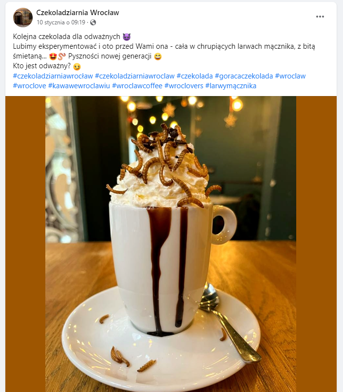 Zajrzałam do komentarzy, żeby sprawdzić, czy znalazł się ktoś, kto deklaruje gotowość do konsumpcji deseru z robalami. Znalazło się paru „odważnych”. – Wow, czad! Kreatywne i niespotykane, myślę, że warto spróbować:) – napisała jedna „odważna”. – Robaki są pycha i cudownie chrupiące. Trzeba tylko przełamać uprzedzenia – napisała druga „odważna”. Trzeci „odważny” zapewnił, że wpadnie, jak tylko znajdzie wolny czas. Znalazł się też jeden „światowiec”, który pochwalił się, że w Chinach jadł „pyszne pieczone robaczki”. Ale na ponad 300 komentarzy była to kropla w morzu. Większość komentujących zadeklarowała, ze noga ich więcej nie postanie w kawiarni, w której serwuje się robaki.
