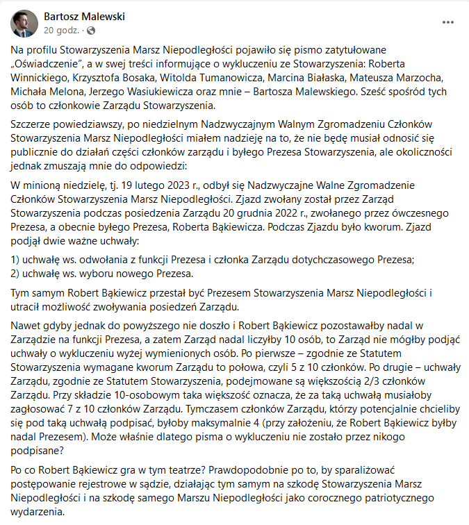 Powołany w niedzielę na funkcję prezesa SMN Bartosz Malewski wyjaśnił, że rzekome wykluczenie członków zarządu jest bezprawne, ponieważ musiałoby za nim głosować siedmiu członków zarządu. Jednocześnie wskazał, że jedynym celem Roberta Bąkiewicza jest próba sparaliżowania postępowania rejestrowego w sądzie.