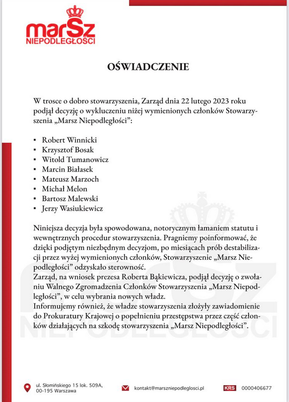 W środę (22.02.2023) na Twitterze ukazało się oświadczenie Stowarzyszenia Marsz Niepodległości, w którym poinformowano o wykluczeniu ośmiu osób, w tym Roberta Winnickiego i Krzysztofa Bosaka oraz sześciu członków zarządu. Powodem wykluczenia ma być „notoryczne łamanie statutu i wewnętrznych procedur stowarzyszenia”.