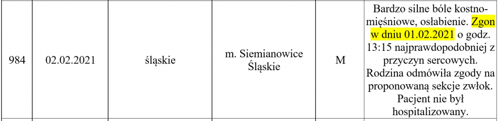 Informacja o pierwszym zgonie pojawiła się na ministerialnej liście 22 stycznia i dotyczyła pacjenta zmarłego dwa dni wcześniej. Wpis na listę NOP nastąpił po interwencji rodziny, która zgłosiła sprawę do prokuratury.