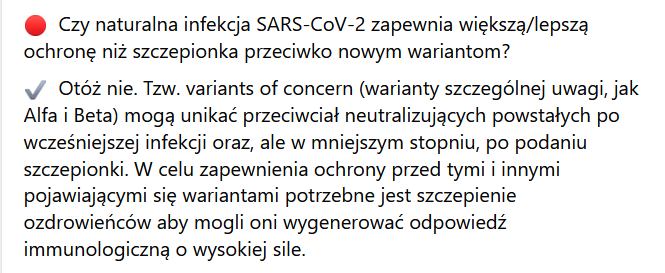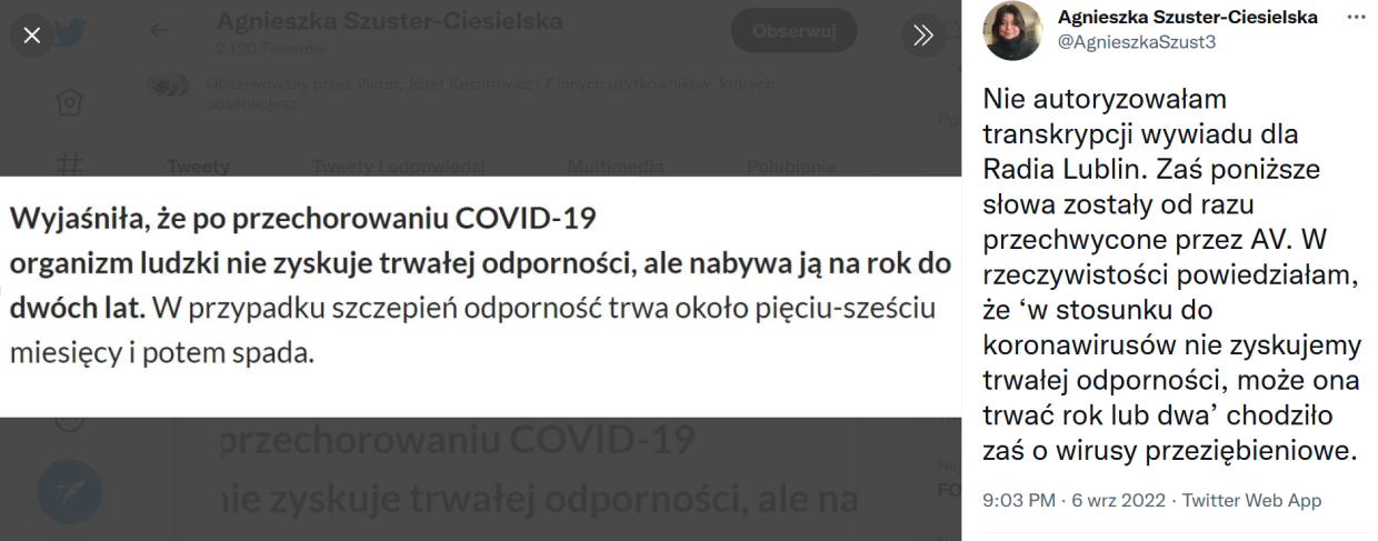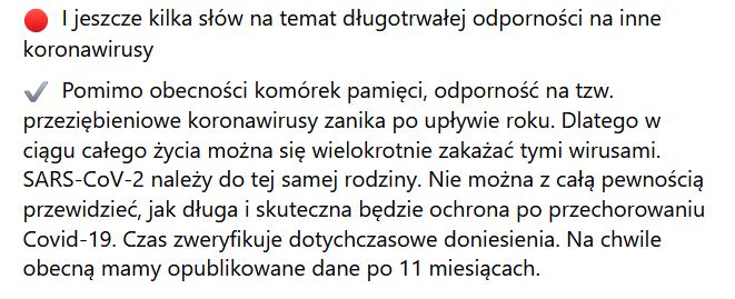 A zatem przypomnijmy, co Szuster-Ciesielska pisała o SARS-CoV-2 w czerwcu 2021: Odporność na tzw. przeziębieniowe koronawirusy zanika po upływie roku. Dlatego w ciągu całego życia można się wielokrotnie zakażać tymi wirusami. SARS-CoV-2 należy do tej samej rodziny. Nie można z całą pewnością przewidzieć, jak długa i skuteczna będzie ochrona po przechorowaniu Covid-19. Czas zweryfikuje dotychczasowe doniesienia. Na chwilę obecną mamy opublikowane dane po 11 miesiącach.