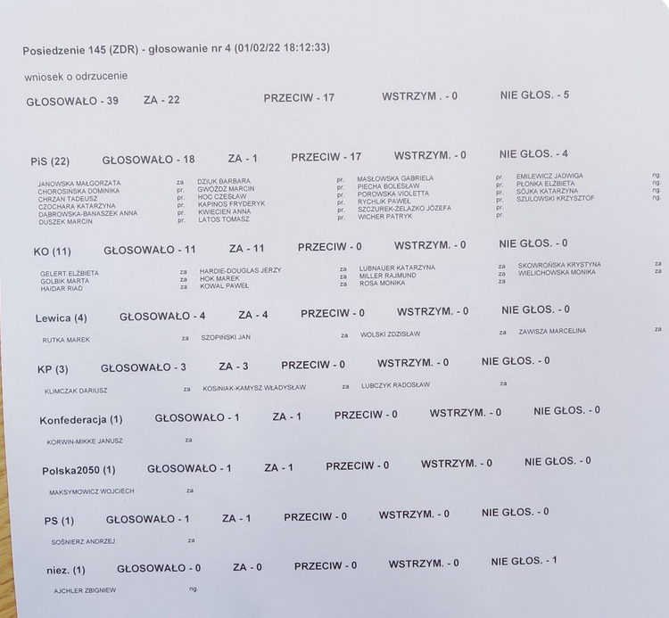 Koalicja Obywatelska oraz Konfederacja złożyły wnioski o odrzucenie ustawy w pierwszym czytaniu. Wniosek został przyjęty. Imienne wyniki głosowania poniżej.