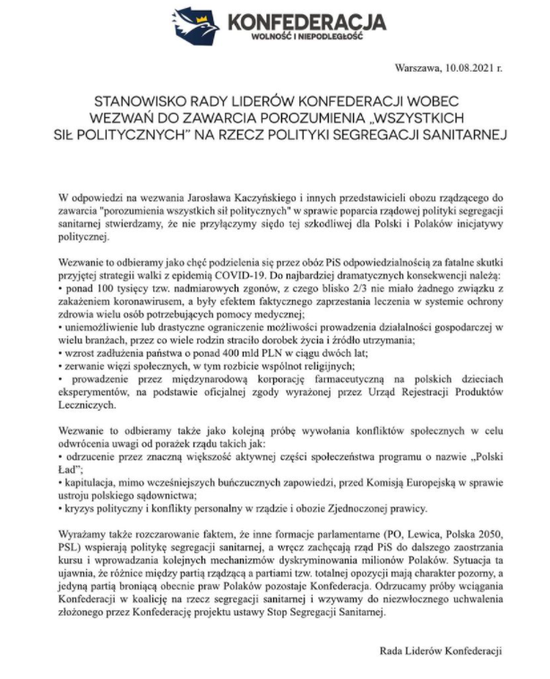 W sobotnim (7.08.2021) wywiadzie dla PAP, prezes PiS Jarosław Kaczyński wezwał wszystkie partie do podpisania porozumienia dotyczącego „zdecydowanych działań w walce z epidemią”. Zapowiedział też wprowadzenie obostrzeń dla osób niezaszczepionych. We wtorek (10.08.2021) Konfederacja wydała oświadczenie, w którym nazywa apel Kaczyńskiego „szkodliwą dla Polski i Polaków inicjatywą polityczną”, do której się nie przyłączy.