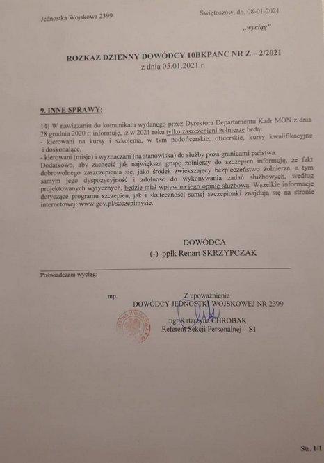Segregacja sanitarna w Wojsku Polskim jest faktem. Poseł Grzegorz Braun opublikował na Twitterze rozkaz ppłk Renarta Skrzypczaka ze stycznia 2021 roku, na mocy którego pozbawia się niezaszczepionych żołnierzy możliwości uczestniczenia w kursach podoficerskich i oficerskich. Przyjęcie szczepionki ma też mieć wpływ na opinię służbową żołnierza. Tak wygląda „dobrowolność” kowidowych szczepień w Wojsku Polskim.