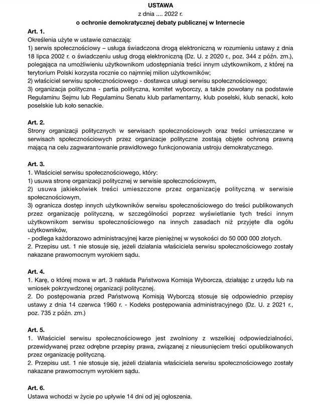 W piątek (7.01.2022) Konfederacja przedstawiła projekt ustawy o ochronie demokratycznej debaty w Internecie. Proponowane przepisy wprowadzają ochronę prawną dla stron i treści zamieszczanych w serwisach społecznościowych przez organizacje polityczne. Usuwanie takich stron i treści, lub ograniczanie ich zasięgu maiłoby być zagrożone karą od 50 milionów złotych. Karę miałaby nakładać Państwowa Komisja Wyborcza.
