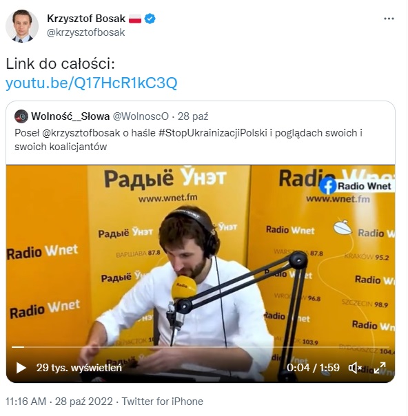 Rzeczony wpis Bosaka odnosił się do jego omawianej wcześniej wypowiedzi dla Radia Wnet, w której ten przyznał rację Grzegorzowi Braunowi: