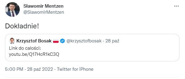 Powyższe sprawia wrażenie próby ucierania różnic w kontekście stosunku do ukrainizacji przez Sławomira Mentzena, jednocześnie zachowując znane wcześniej podejście krytyki imigracji w celach socjalnych. Nijak jednak nie można tego określić mianem „odcinania się” od Grzegorza Brauna. Sławomir Mentzen traktuje temat jako drugorzędny, wtórny wobec kwestii wyłudzania „socjalu” przez Ukraińców, gdzie akurat znajduje wspólny język zarówno z Bosakiem, jak i samym Grzegorzem Braunem. Mentzen ewidentnie nie stawia kwestii występujących różnic na ostrzu noża, nie ma jednak mowy o dystansowaniu się od akcji firmowanej przez Grzegorza Brauna i wspieranej przez Krzysztofa Bosaka.